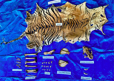 Dirreskrimsus Polda Aceh, Kombes Pol. Zulhir Destrian, menjelaskan, pihaknya berhasil mengamankan barang bukti berupa selembar kulit Harimau Sumatera, 16 kuku, dua taring, satu tulang jari, dua tulang pinggul, satu tulang sendi, satu tulang kepala, dan dua unit handphone.