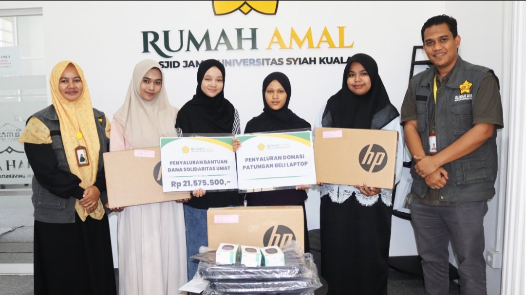 Berkat gotong royong dan kepedulian seluruh civitas akademika, Rumah Amal Masjid Jamik Universitas Syiah Kuala (USK) menyalurkan bantuan lanjutan berupa tiga unit laptop dan sejumlah uang tunai, Rabu (8/9/2025).