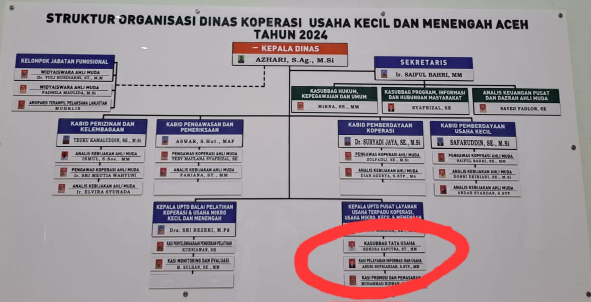 Tanda kurung merah adalah posisi Hendra Saputra beberapa bulan lalu sebelum dilantik jadi Kabid Pemberdayaan Ekonomi Kecil, hanya seorang Kasubbag pada UPTD. Dia melangkahi pejabat eselon III senior yang memiliki pengalaman dan rekam kinerja di instansi induk.