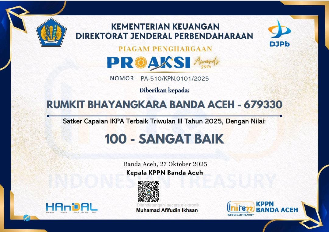 Ia menegaskan bahwa penghargaan ini merupakan hasil komitmen seluruh jajaran dalam memperkuat tata kelola keuangan dan pelayanan publik. “Rumkit Bhayangkara meraih peringkat pertama Proaksi Triwulan III Tahun 2025 dari KPPN Banda Aceh untuk kategori BLU dengan Laporan Pertanggungjawaban tercepat dan tepat se-Provinsi Aceh. Ini menunjukkan komitmen kami terhadap kecepatan, ketepatan, dan integritas dalam setiap proses pelaporan,” ujar dr. Jamal, Kamis (30/10/2025).