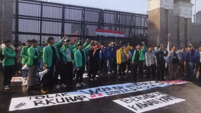 KabarAktual.id – Ratusan mahasiswa bersama Koalisi Masyarakat Sipil menggelar aksi demonstrasi di depan Gedung DPR RI, Jalan Gatot Subroto, Jakarta Pusat, Selasa (18/11/2025). Mereka menolak pengesahan Kitab Undang-Undang Hukum Acara Pidana (KUHAP) yang baru.