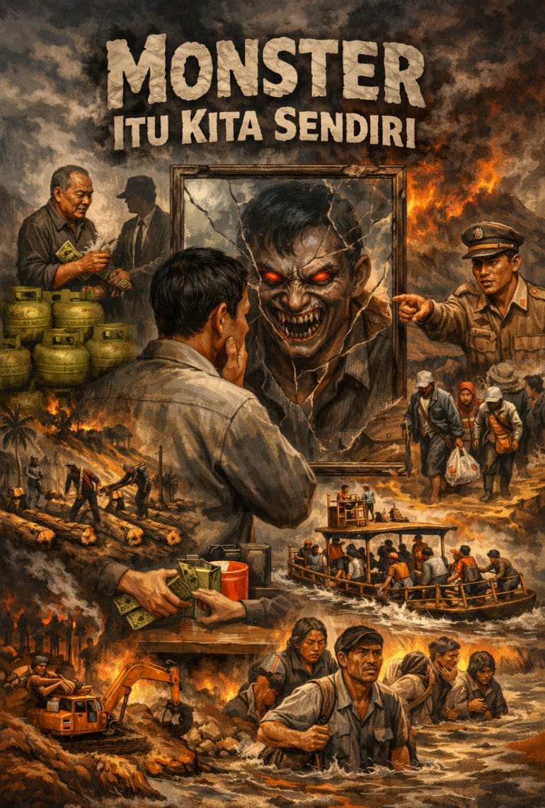 Kita terlalu sibuk menunjuk, terlalu gemar mencari siapa yang salah. Telunjuk kita liar, menari ke segala arah, berharap menemukan kambing hitam yang bisa dipersembahkan sebagai tumbal. Padahal, jika berani menunduk dan bercermin, wajah yang tampak di sana adalah wajah kita sendiri. “Monster” itu bukan makhluk asing. Monster itu adalah kita.