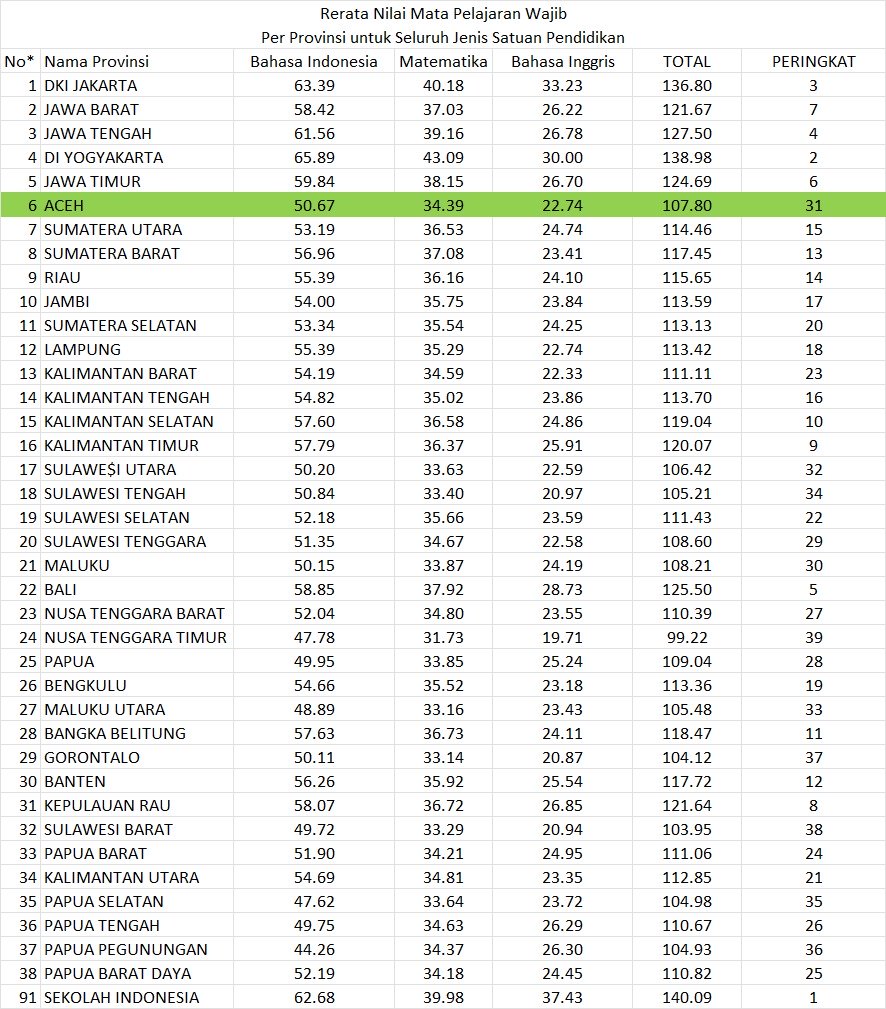 Berdasarkan data yang diperoleh dari posko TKA Disdik Aceh, total nilai rerata mata pelajaran wajib yang mampu diraih siswa Aceh hanya 107,80. Rinciannya: Bahasa Indonesia 50,67; Matematika 34,39, dan Bahasa Inggris 22,74.