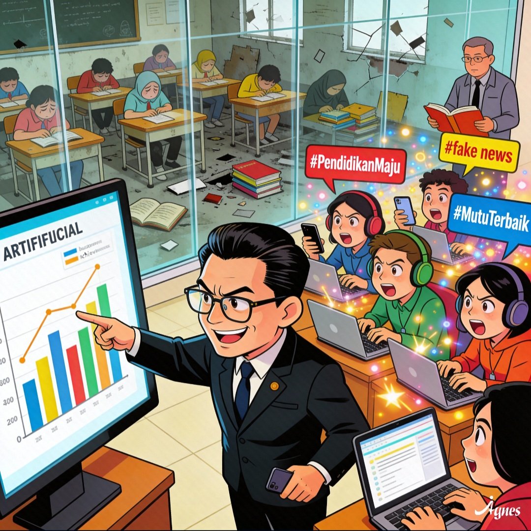 Kepemimpinan birokrasi pendidikan terlalu sibuk pada pencitraan—mengisi pemberitaan, merayakan diri, membangun ilusi pencapaian—sementara skor asesmen siswa diam-diam anjlok, dan publik hanya mendengar realitas yang berbeda ketika data nasional akhirnya dirilis.