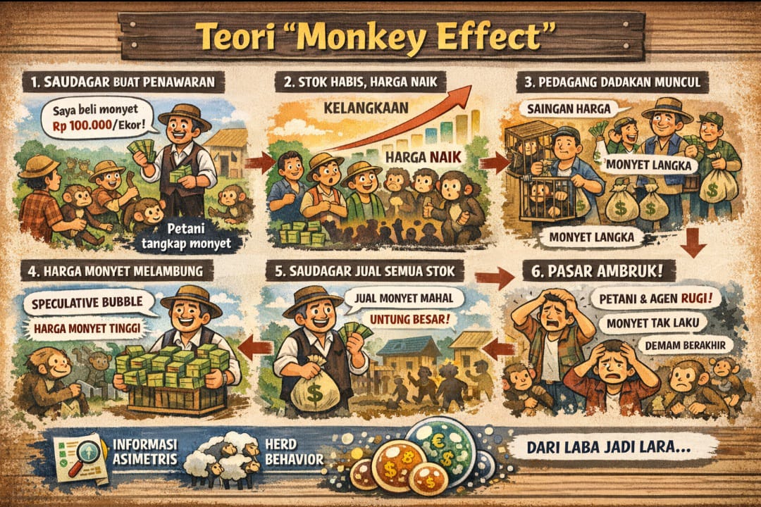 Pada akhirnya, monkey effect bukan sekadar cerita tentang monyet. Ia adalah alegori tentang bagaimana ekonomi bekerja ketika rasionalitas dikalahkan oleh euforia, dan ketika kekuasaan informasi menjadi alat akumulasi keuntungan sepihak.