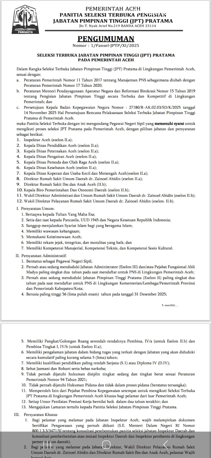 Berdasarkan pengumuman Pansel nomor 1/Pansel-JPTP/XI/2025 tanggal 20 November 2025 yang ditandatangani M. Nasir selaku ketua, terdapat sejumlah persyaratan mengikuti seleksi JPT Pratama. Persyaratan umum berisi hal-hal normatif terdiri atas tujuh poin dimulai syarat bertaqwa kepada Tuhan yang Maha Esa hingga memiliki kompetensi manajerial, kompetensi teknis, dan kompetensi sosio kultural.