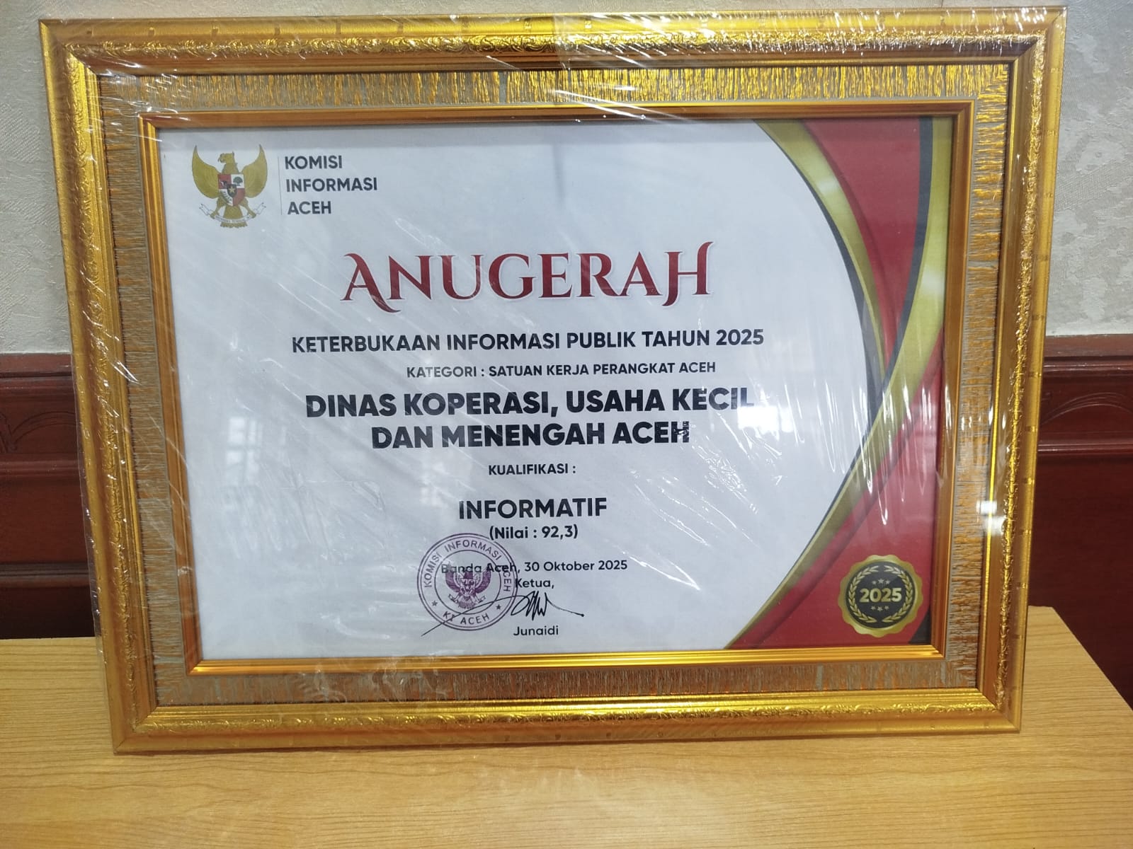 Berdasarkan hasil Monitoring dan Evaluasi (Monev) Keterbukaan Informasi Publik Tahun 2025 yang dilakukan Komisi Informasi Aceh (KIA), Dinas Koperasi dan UKM Aceh memperoleh kualifikasi Informatif, kualifikasi tertinggi dalam penilaian keterbukaan informasi publik.