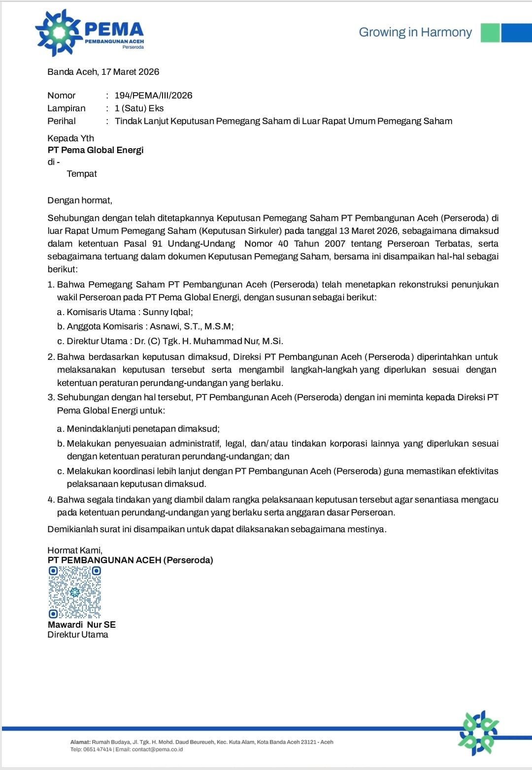 KabarAktual.id — Gubernur Aceh Muzakir Manaf atau Mualem menunjuk putranya, Sunny Iqbal, sebagai Komisaris Utama PT Pembangunan Global Energi (PGE). Penunjukan tersebut dilakukan dalam kapasitasnya sebagai pemegang saham pada PT Pembangunan Aceh (Perseroda).