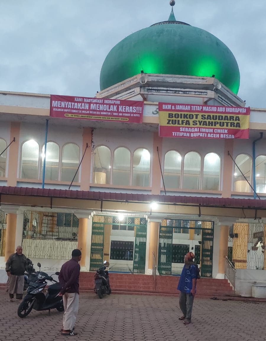 Beberapa spanduk dipasang di bangunan masjid sebagai protes atas keputusan Bupati Aceh Besar yang menunjuk ajudan menjadi imam chik Masjid Abu Indrapuri (foto: Ist)