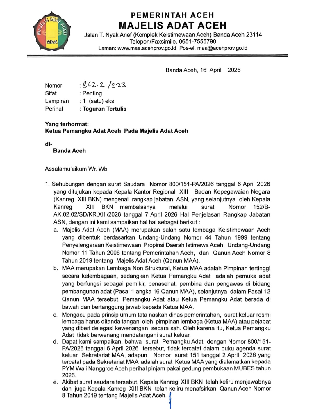 Dalam surat peringatannya, ketua MAA menyebut ketua pemangku adat mengirim surat bernomor 800/151-PA/2026 tertanggal 6 April 2026 kepada Kepala Kanreg XIII BKN terkait persoalan rangkap jabatan aparatur sipil negara (ASN). BKN kemudian meresponnya melalui surat Nomor 152/B-AK.02.02/SD/KR.XIII/2026 tertanggal 7 April 2026.