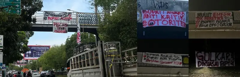 Di Simpang Tugu Mesra, spanduk bertuliskan “Golkar Dikuasai Bupati Aceh Tenggara”. Sedangkan di Jembatan Lamnyong terpasang tulisan “Bupati Agara Antikritik” dan “Otoriter”.