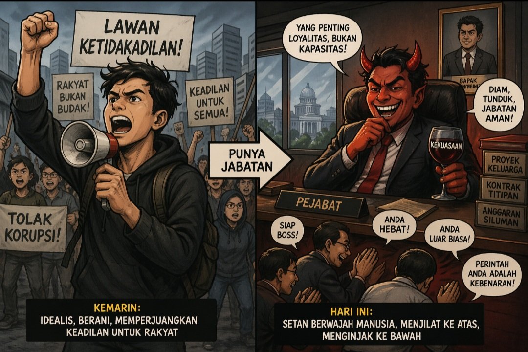 Ya. Ketika idealisme yang disuarakan di jalanan kemudian “dibarter” dengan SK Komisaris, Timsus, bahkan hingga Menteri atau kepala badan.