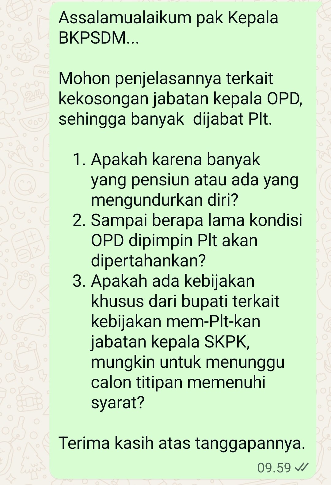 Data yang dihimpun hingga Rabu (29/4/2026), sedikitnya terdapat 10 jabatan kepala OPD yang belum diisi pejabat definitif. Adapun jabatan yang masih kosong meliputi: